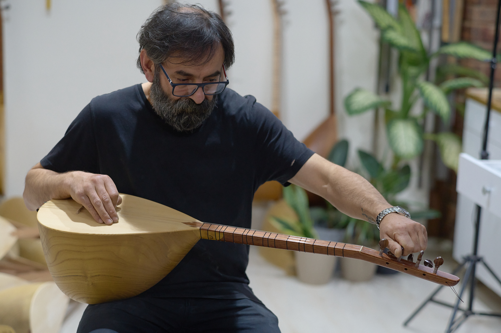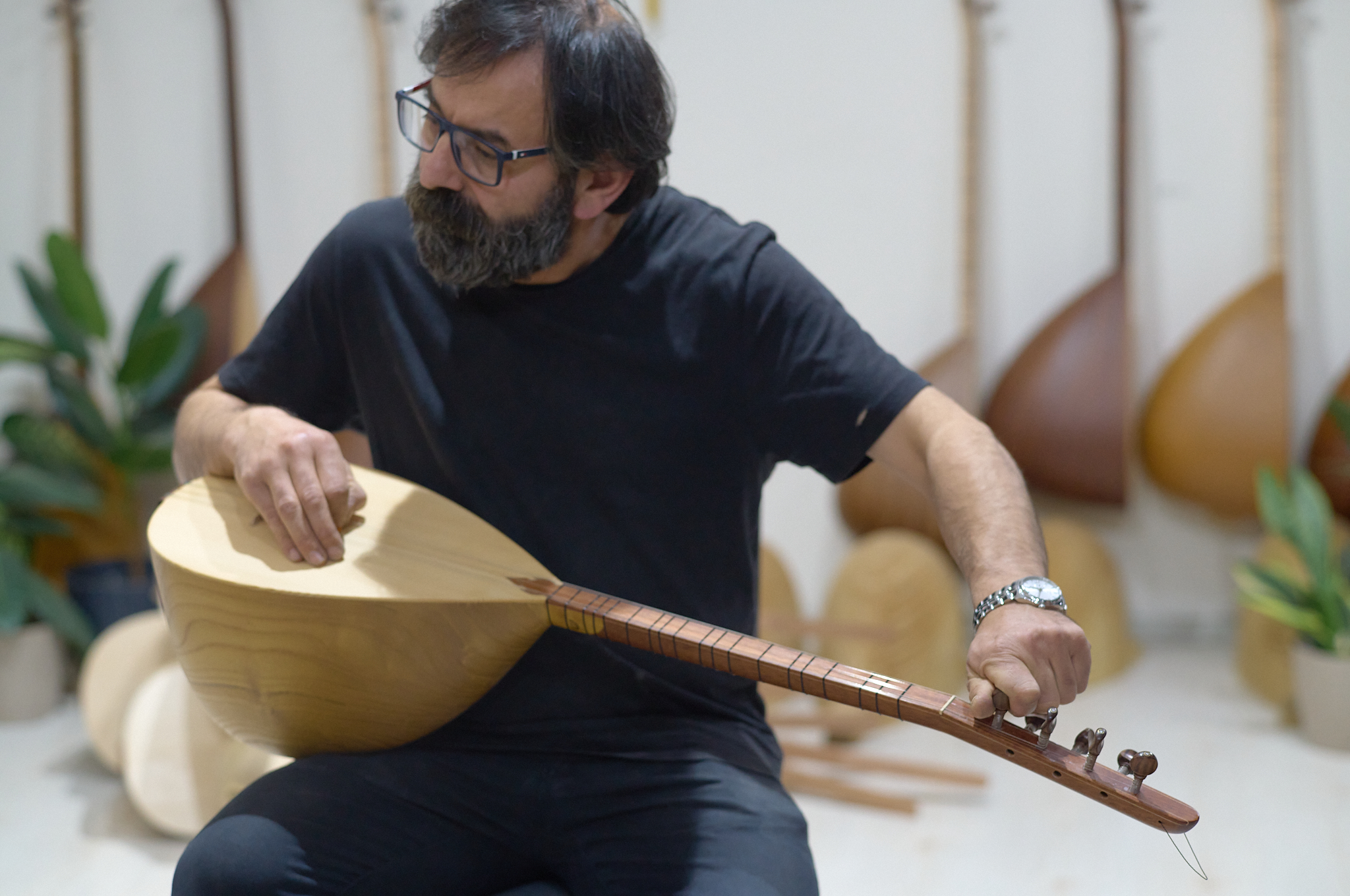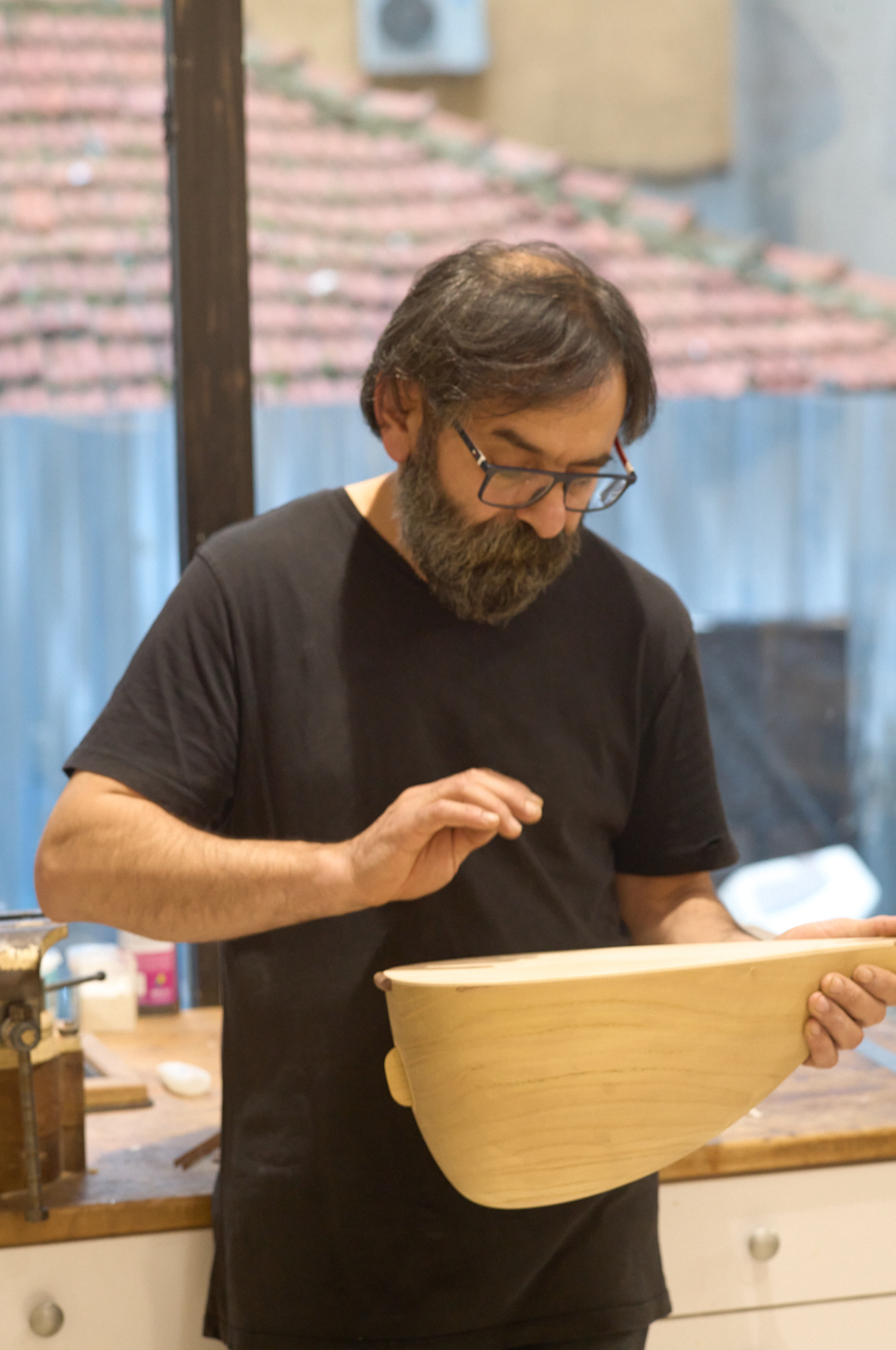 j’ai eu la chance de rencontrer Kenan, artisan-luthier passionné, qui m’a chaleureusement ouvert son atelier. Dans le parfum du bois fraîchement travaillé et le silence vibrant des cordes, j’ai découvert un artisan habité par la quête de justesse et de résonance. Sa manière de donner vie à l’instrument rejoignait ma propre recherche : capter la lumière, saisir l’instant, transmettre une vérité.