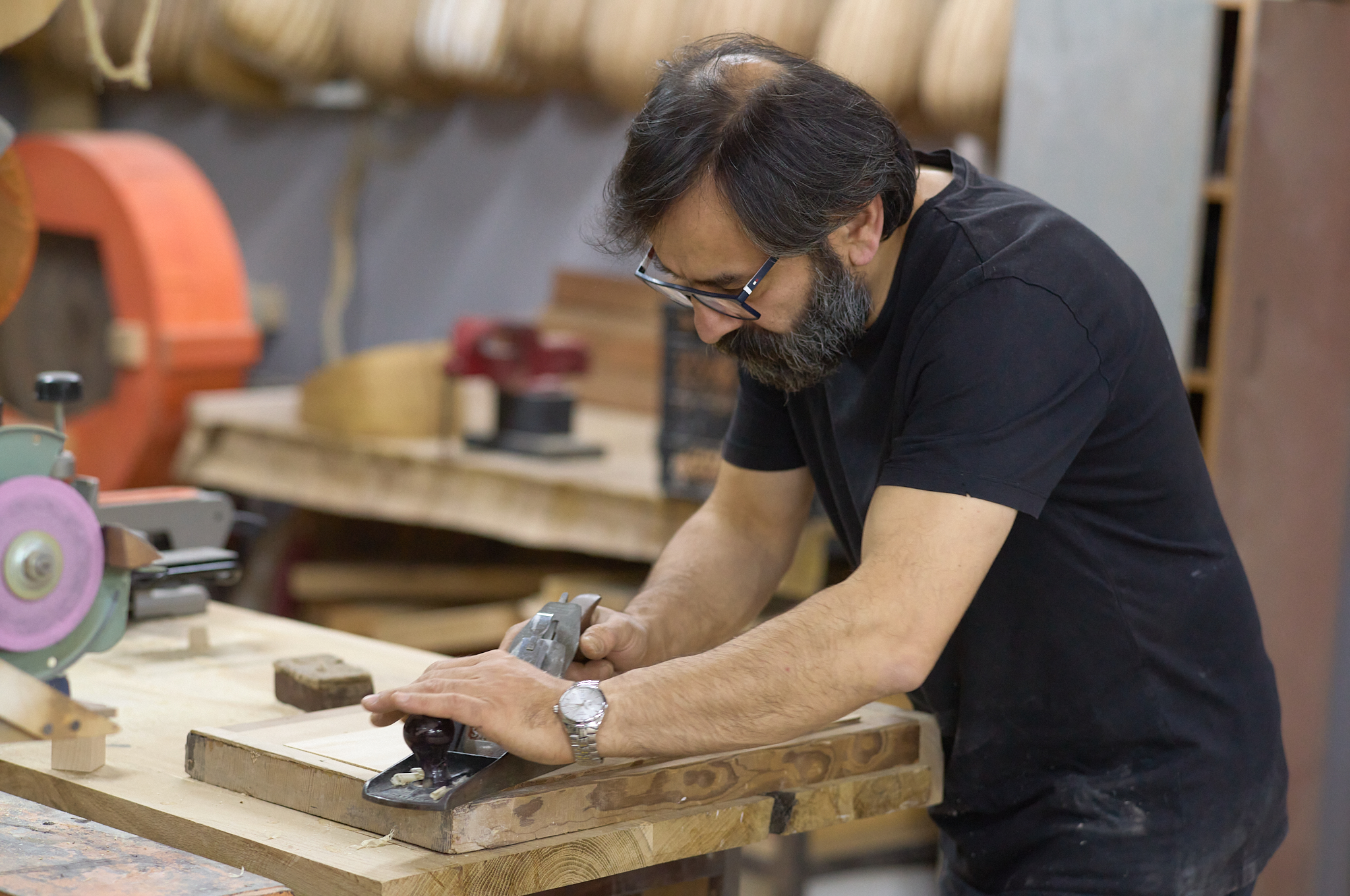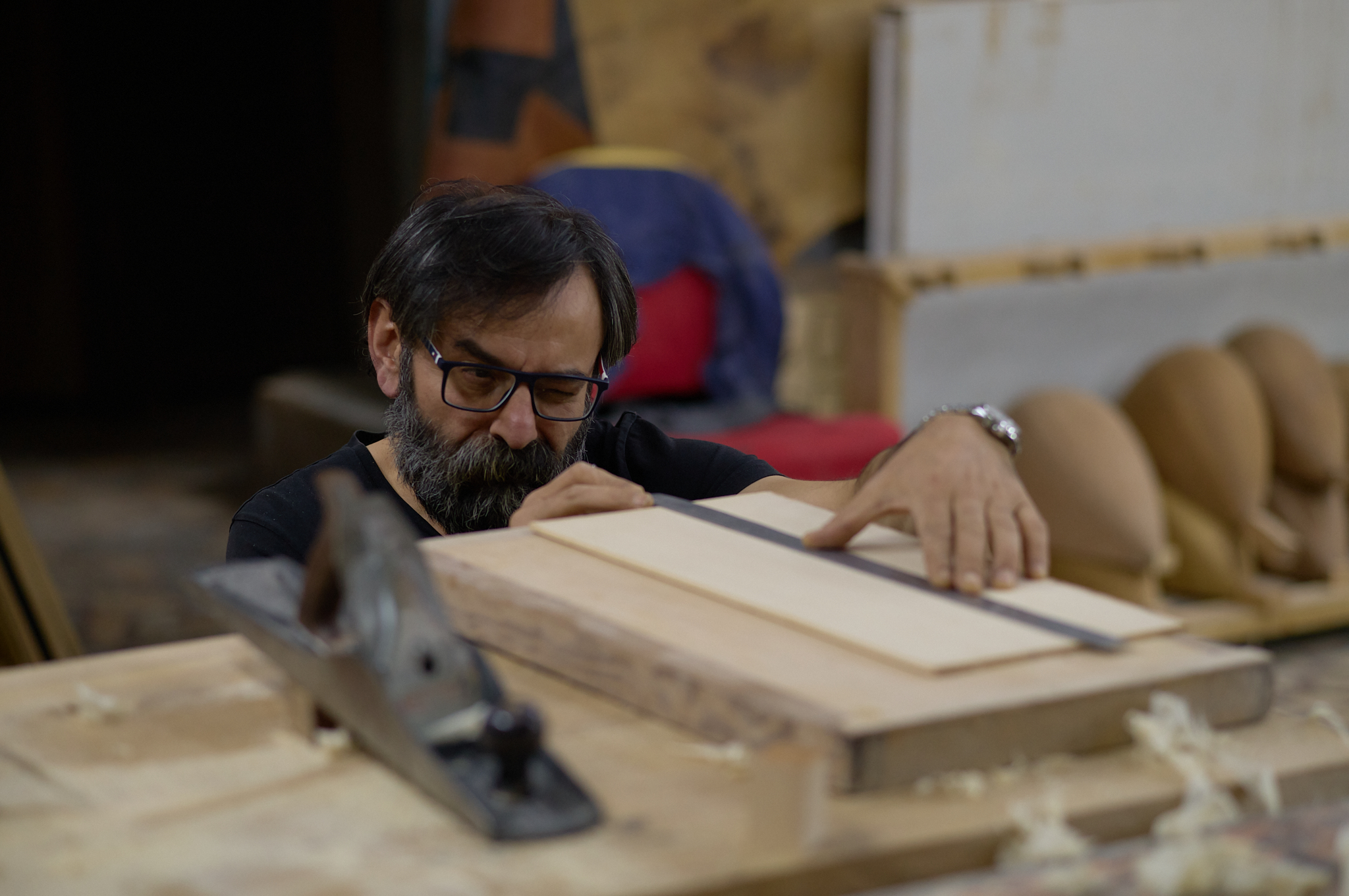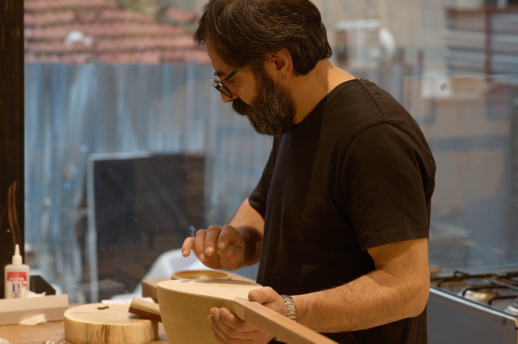 j’ai eu la chance de rencontrer Kenan, artisan-luthier passionné, qui m’a chaleureusement ouvert son atelier. Dans le parfum du bois fraîchement travaillé et le silence vibrant des cordes, j’ai découvert un artisan habité par la quête de justesse et de résonance. Sa manière de donner vie à l’instrument rejoignait ma propre recherche : capter la lumière, saisir l’instant, transmettre une vérité.